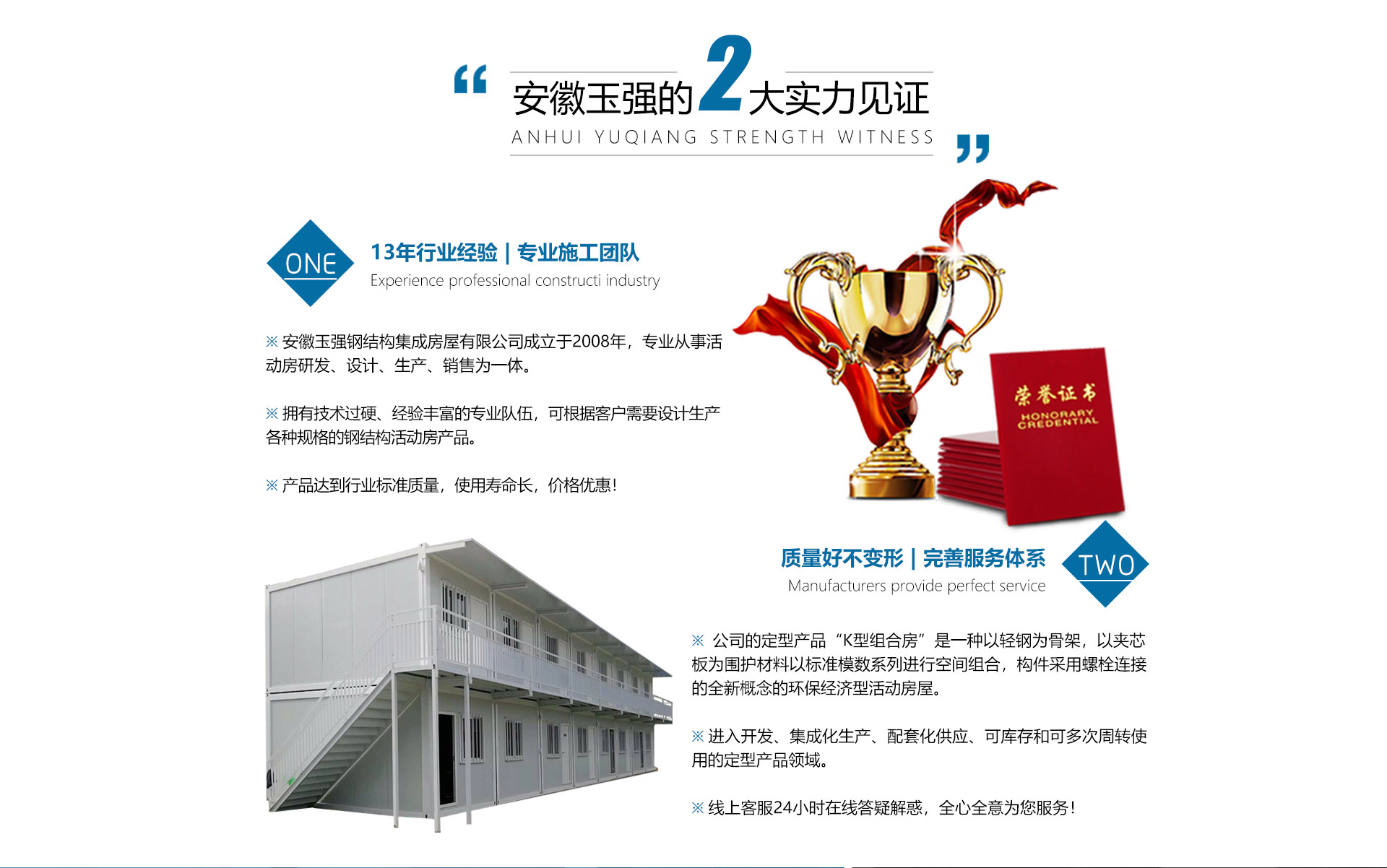 關(guān)于我們安徽玉強(qiáng)鋼結(jié)構(gòu)集成房屋有限公司是一家集研發(fā)、設(shè)計(jì)、生產(chǎn)、銷售服務(wù)于一體的活動(dòng)房與集裝箱制造企業(yè),公司隊(duì)伍具有多年鋼結(jié)構(gòu)制作及產(chǎn)品檢測(cè)經(jīng)驗(yàn),嚴(yán)格按照鋼結(jié)構(gòu)標(biāo)準(zhǔn)要求制作、檢測(cè)。致力于提供研、產(chǎn)、銷、于一體,有著多年積累的先進(jìn)生產(chǎn)技術(shù)和豐富工作經(jīng)驗(yàn),采用精良的工藝技術(shù),生產(chǎn)美觀大方的定型產(chǎn)品,長(zhǎng)期以來(lái),受廣大用戶的信賴和支持。歡迎您的來(lái)電咨詢。